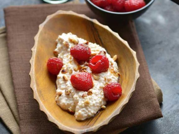 - Die Hirsecreme in eine Schale geben. Die Himbeeren mit der Marinade darauf anrichten und mit den Haselnüssen bestreuen.