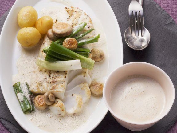 Dieses Gericht hat Potential für ein Gänge-Menü. Zartes Kabeljaufilet wird mit Champignons, Frühlingszwiebeln, kleinen Kartoffeln und Apfelweinsauce ergänzt. Klingt köstlich, oder?