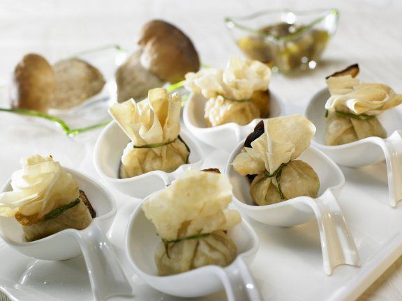 Sie planen ein Buffet oder kleine Snacks für eine Party? Dann sollten Sie die Steinpilzbeutelchen kredenzen. Das Pesto aus Walnüssen, Pinienkernen und Haselnüssen sorgt für eine winterliche Note.