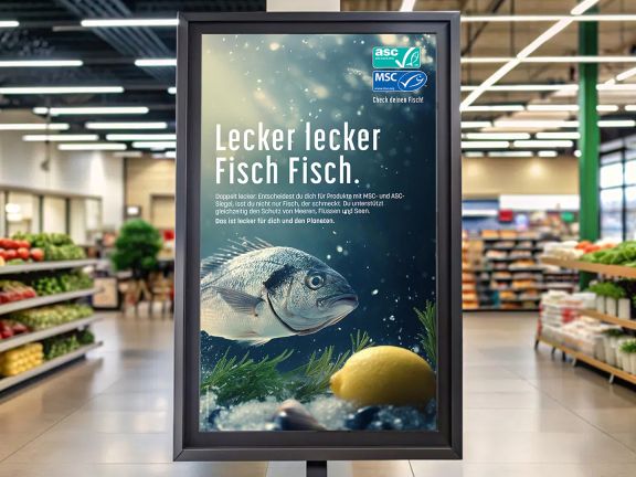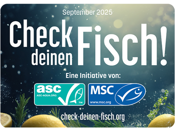 Die Kampagne „Check deinen Fisch!“ der gemeinnützigen Organisationen ASC und MSC macht sich für nachhaltigen Fischkonsum stark. Sie ruft dazu auf, beim Einkauf gezielt auf die ASC- und MSC-Siegel zu achten, als verlässliche Orientierung für Fisch aus verantwortungsvoller Zucht oder nachhaltiger Fischerei. Im September ist die Kampagne über Social Media, Außenwerbung, Radiospots sowie durch zahlreiche Partner im Lebensmitteleinzelhandel und bei Food Brands präsent.