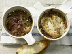 Zwiebelsuppe mit überbackenem Käse-Baguette. Ein echter französisscher Klassiker, den Sie unbedingt einmal zu Hause probieren sollten.
