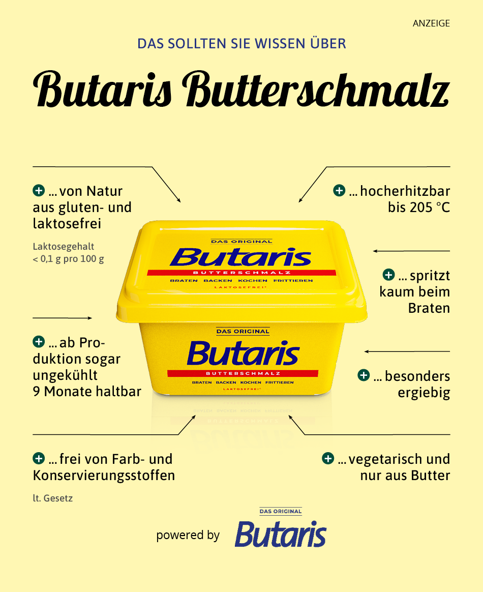 Weitere Informationen zu Butaris Butterschmalz und Rezepte finden Sie unter www.butaris.de sowie bei Pinterest, Facebook und Instagram.