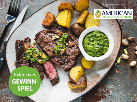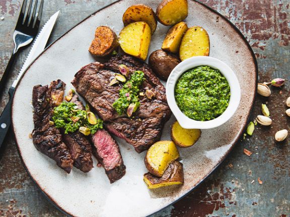 Egal, ob vom Grill oder aus der Pfanne: Dieses Gericht ist so simpel in der Zubereitung und macht doch richtig Eindruck. Der Clou ist die Sauce zum Steak. Kombiniert mit aromatischem Koriander und würzigen Frühlingszwiebeln kommen die gesalzenen Pistazienkerne besonders gut zur Geltung. Ein wenig Limettensaft verleiht dem Ganzen Frische.