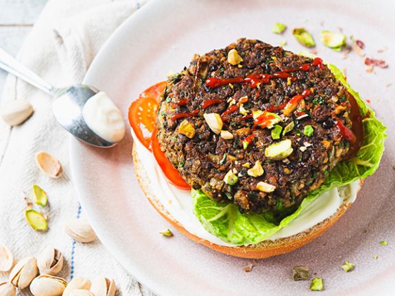Burger sind ein echter Klassiker und funktionieren auch super ohne Fleisch. Der supersaftige Veggie-Patty aus braunen Linsen und gebratenen Pilzen wird hier mit fein gehackten Pistazien ergänzt, die für den perfekten Crunch sorgen.