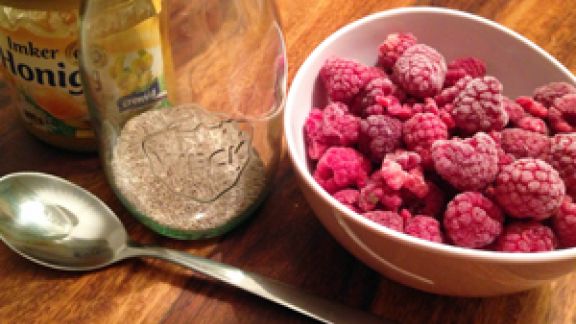 - 200 Gramm Früchte (Tiefgefroren oder frisch, Himbeeren eignen sich besonders gut, aber auch mit Erdbeeren & Co. lässt sich Chia-Marmelade herstellen. Generell können Sie jedes Obst verwenden, welches sich gut pürieren oder zerdrücken lässt.)