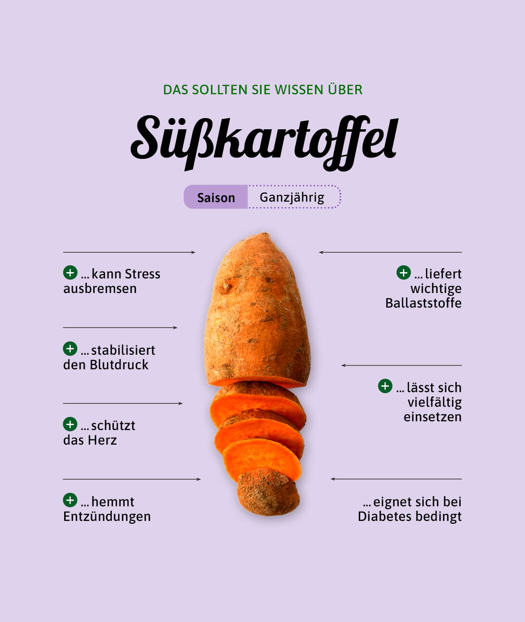 - ...hemmt Entzündungen:Die sekundären Pflanzenstoffe – vor allem Anthocyane und Carotinoide – in Süßkartoffeln schützen unsere Körperzellen gegen oxidativen Stress. Im Klartext: Sie schützen die Körperzellen, wirken entzündungshemmend und können vorbeugend gegen Alterungsprozesse und Rheuma wirken.