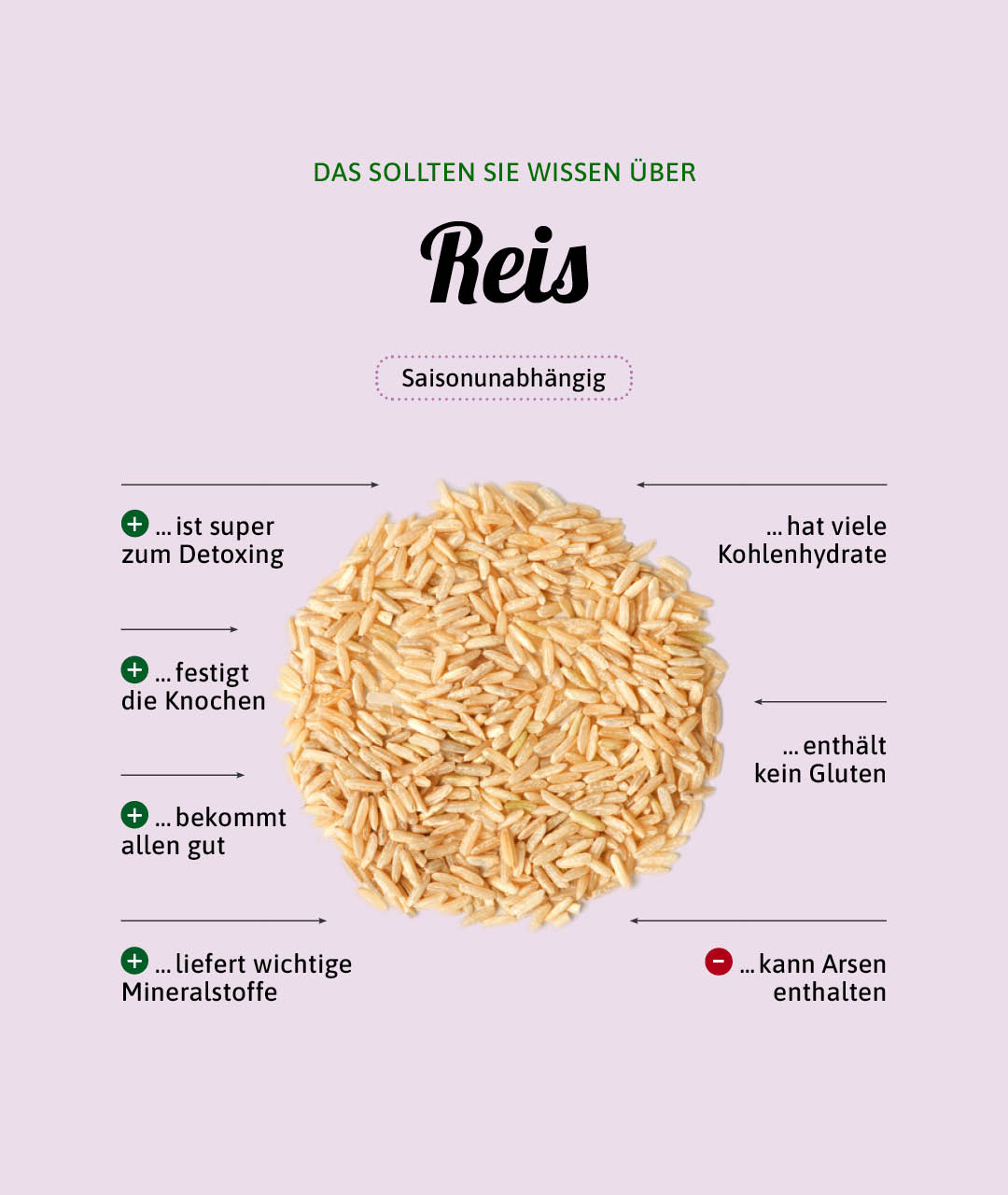 Immer wieder ergeben Untersuchungen, dass in Reis relativ hohe Mengen an anorganischem Arsen stecken. Das Bundesinstitut für Risikobewertung (BfR) gibt trotzdem Entwarnung, zumindest für Erwachsene, und rät nur dazu, Reis nicht gerade täglich zu essen. Ein weiterer Tipp des BfR: Da Arsen sich in Wasser löst, den Reis immer gründlich waschen, in reichlich Wasser garen und überschüssiges Kochwasser wegschütten.