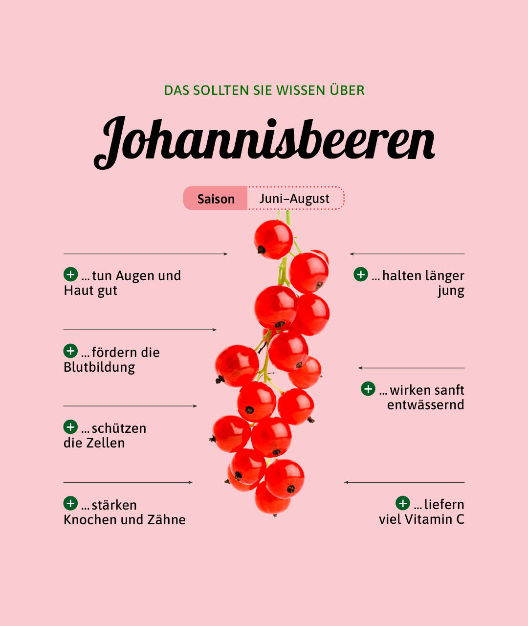 Durch ihre zahlreichen Antioxidantien wehren die süß-säuerlichen Johannisbeeren freie Radikale ab und stärken so das Immunsystem. Zudem bremsen Johannisbeeren Entzündungen, denn sie enthalten einen hohen Anteil an antientzündlichen Anthocyanen. Dadurch können sie helfen, chronischen Erkrankungen vorzubeugen.