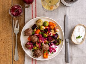Zu den zarten Frikadellen gesellt sich frisches, knackiges Ofengemüse aus Bete, Hokkaido und Rosenkohl. Abgerundet wird der Winterschmaus mit würzigem Ziegenkäsedip und eingelegten Zwiebelchen. Wie wäre es mit einem leckeren Glas Bechtheimer Chardonnay vom Weingut Dackermann dazu? Ein vielschichtiger, saftiger Wein mit feiner Holznote. Die erdigen Noten des Gemüses, die Feinheit des Ziegenkäsedips und die Aromen des Weins von Steinfrucht, Birne und Brioche sorgen für viel Genuss.